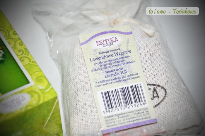 Drugim produktem jest pachnący woreczek – Lawendowe Wzgórze. Ja te woreczki zawsze wrzucałam do szuflad z ubraniami i wtedy za każdym razem jak je otwierałam unosił się z nich piękny zapach. Woreczki jeszcze dłużej niż saszetki utrzymują swój zapach. W środku lnianego woreczka są wiórki bukowe. Oczywiście woreczki dostępne są w wielu zapachach – herbaciana zieleń, jaśminowa rosa, bergamotkowe orzeźwienie, cyprysowa aleja, melonowy nektar, cedrowy płomień, różany ogród, waniliowy dotyk i lawendowe wzgórze :) W tych zapachach dostępne są w zasadzie prawie wszystkie produkty z Pachnącej Szafy. Zapomniałam dodać, że woreczek kosztuje na Merlinie – 9,99zł (KLIK).