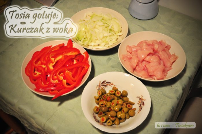 Najpierw musimy sobie wszystko przygotować. Ja zawsze zaczynam od mięska, które kroję na małe kawałki. A! W czasie jak wszystko kroimy, gotujemy makaron :) No. Następnie cebulę kroimy w półksiężyce, oliwki przekrajamy na pół, a paprykę kroimy na paseczki.