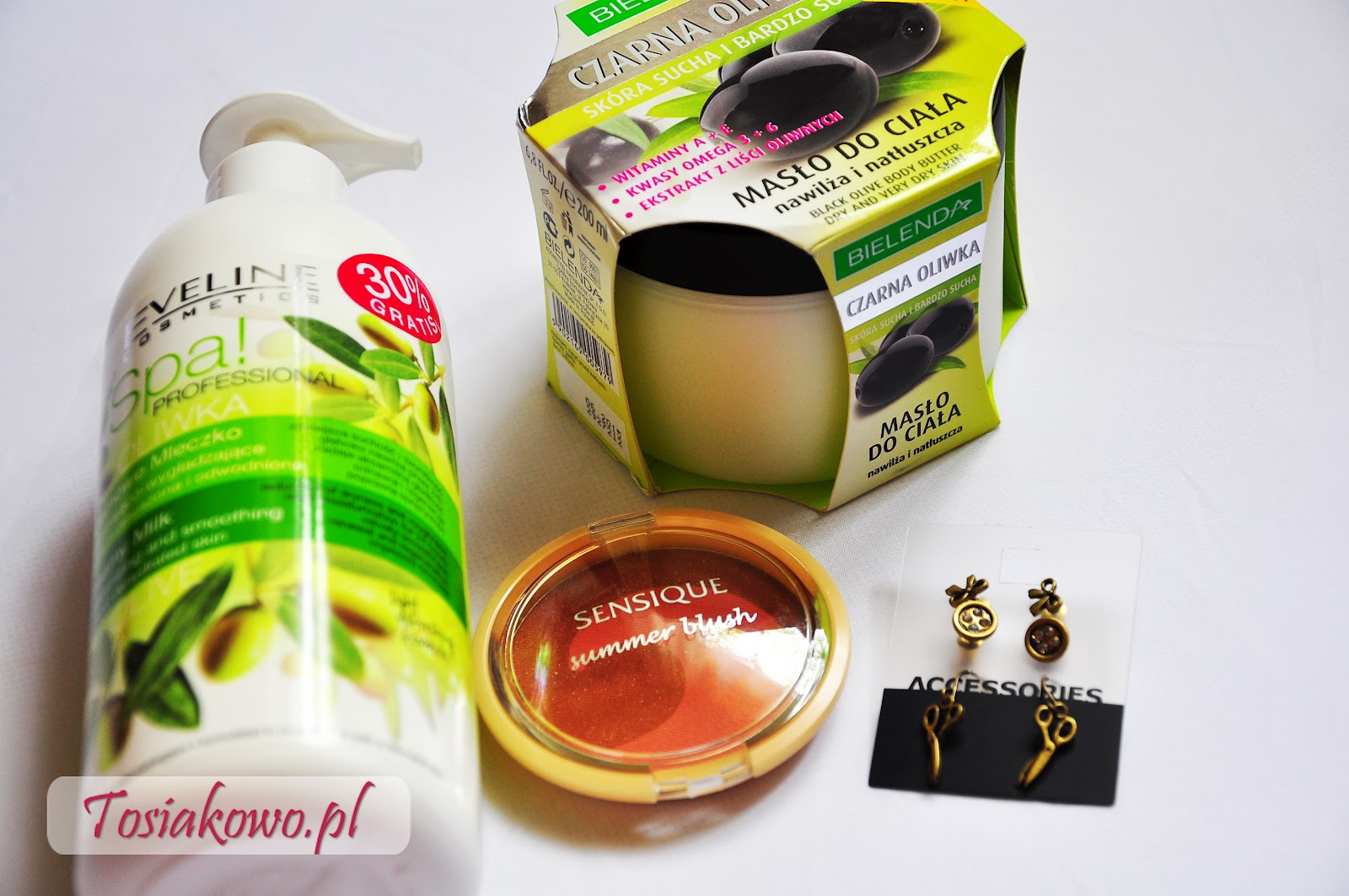 Ostatnie dwie rzeczy to bronzer z Sensique. Kupiłam ten brązowo różowy. Ma bardzo delikatne drobinki, ale po wymieszaniu bardzo ładnie prezentuje się na policzkach. Dorwałam też śliczne kolczyki w trójpaku. Uwielbiam takie zestawy :)