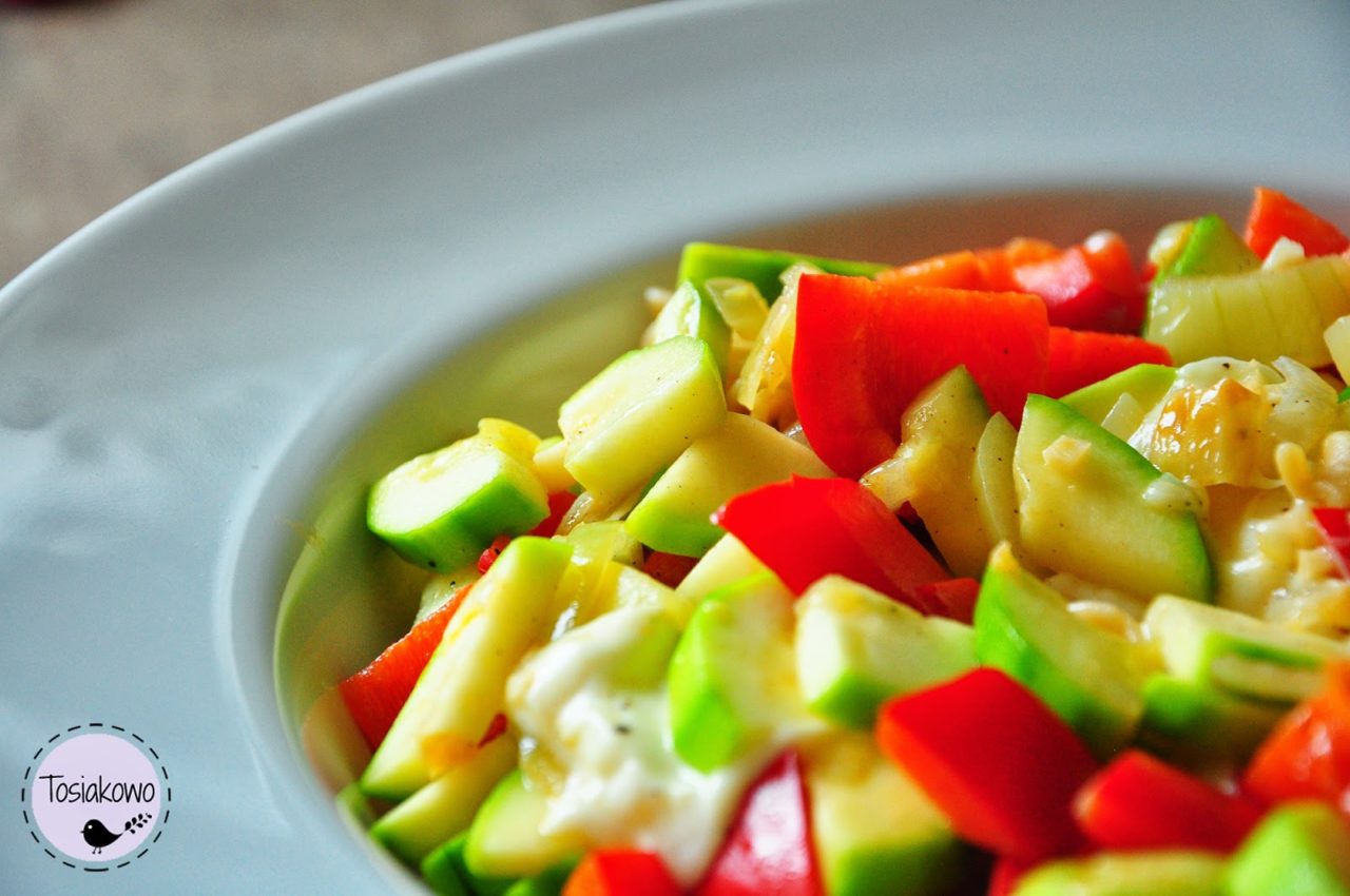 Wykonanie jest banalne. Gotuję makaron na półtwardo, a w tym czasie kroję w piórka cebulę, a w kostkę paprykę i cukinię. Na patelni podsmażam czosnek, potem dodaję do niego cebulę. Do zeszklonej cebulki dodaję paprykę i cukinię. Smażę do miękkości cukinii (ale żeby się nie zrobiła ciapowata) i dodaję ugotowany makaron. Solę i pieprzę. Na koniec dodaję pokrojoną mozzarellę i jeszcze chwilę podsmażam, żeby ser się trochę rozpuścił. Ta dam!